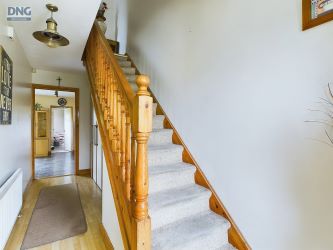 Entrance Hall 5.4 x 1.7. Laminate flooring, alarm panel